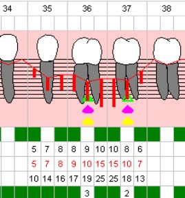 Вижда се добре оголването на зъбните корени в бифуркациите /обозначено със зелените триъгълничета/ в милиметри, отдръпването на венеца /обозначено с червената линия/, както наличието на дълбоко кървене /обозначено с лилавите сърчица/ и гноене /обозначено с жълти сърчица/.