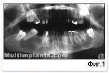 Четири месеца по-късно пациентката се чувстваше добре, а на направената контролна ортопантомография /фиг.4/ се установи хомогенна сянка, изпълваща вече изцяло бившите костни дефекти. Граница с околната здрава кост трудно се долавяше. Според Froum хистологично между 8 и 12 месец след имплантирането на био керамика вече имаме образувана нова кост около гранулите. Това е и най-благоприятния момент за поставяне на вътрекостни имплантати във възстановения участък, тъй като костта вече осигурява достатъчно здрава опора. Ето защо 4 месеца по-късно в областта на 45 и 46 зъби бяха имплантирани 2 вътрекостни имплантата от системата SDV2, съответно 11 и 13 мм. По време на препарирането на имплантатната ложа излизаха костни стружки и по няколко единични гранули био керамика. Контролната ортопантомография /фиг.5/ показа точна адаптация на имплантатите в съответните ложи, но с лека конвергенция на надлъжните оси. Четири месеца по-късно се направи контролна ортопантомография / фиг.6/, която показва почти пълна резорбция на био керамиката и остеоинтеграция на имплантатите. Междувременно бяха депулпирани и изградени с канален щифт и фото полимер Polofil - molar 42, 43 и 44 зъби поради силното разрушаване на коронките им и поради съображение за включване в блок от коронки заедно с имплантатите. Ортопантомографията показа екзактно ендодонтско лечение на посочените зъби и отлично изграждане. Следващата стъпка към протезирането бе разкриването на имплантатите и поставяне на над венечната им част. Такава бе поставена само на медиалния имплантат , тъй като не се постигна добра успоредност при поставянето им. Върху дисталния имплантат бе изградено, "нестандартно" пънче, като в канала на имплантата се ажустира и циментира канален щифт и се изгради пънче от фото полимер. Чрез изпиляване бе постигната необходимата успоредност. Блокът от металокерамични корони бе изработен по класическите правила. На пациентката бе препоръчана стриктна орална хигиена с хлорхексидинови пасти и използването на специфична интер дентална четка за зъби за предотвратяване образуването на плака около цоклите на имплантатите. Препоръчани бяха и контролни прегледи на 6 месеца.